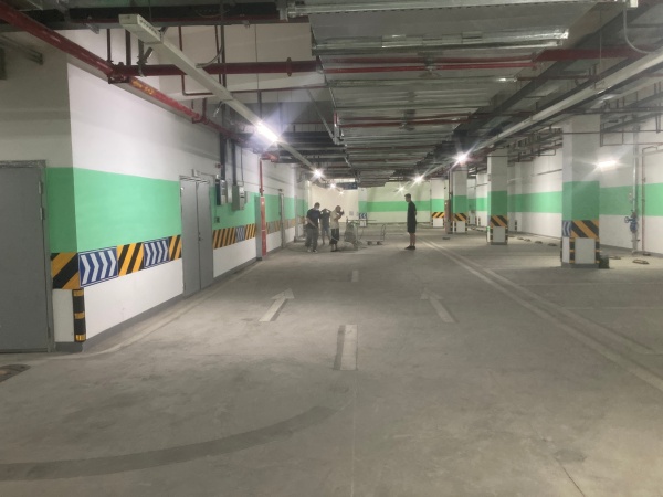 经过专业施工,原本平淡的地下车库焕然一新。环氧地坪表面无缝平滑,具备耐磨、防滑、防尘的特性,能轻松应对日常车辆碾压与人员行走。蓝灰分明的色彩搭配,不仅提升了车库的辨识度,也让整体环境更显整洁明亮。