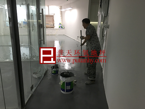 环球中心办公室水性环氧地坪施工中!水性环氧地坪目前已成为办公室铺装类地坪的优先选择,其优势主要表现为:低VOC,绿色环保;装修施工时没有气味,不会影响到周边企业员工的正常上班;用水作为溶剂,更加安全,无需防火。