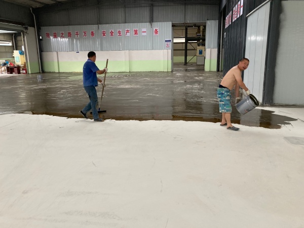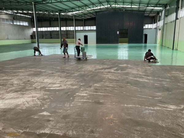 大邑金微健饲料厂完成环氧地坪施工升级:从原始粗糙水泥地,经专业研磨、基层清洁、多层环氧涂层铺设等工序,最终呈现出光亮洁净的绿色地坪。